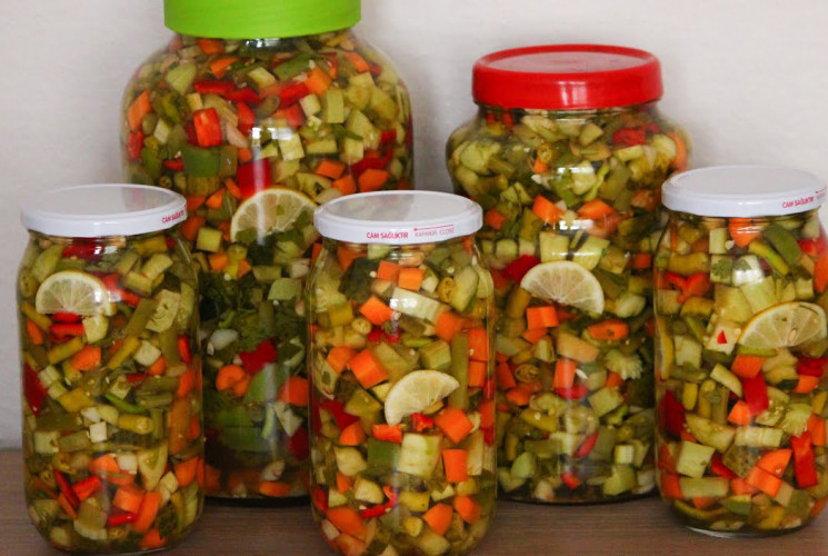 Malzemeler: İstenilen miktar salatalık Havuç Kapya biber 1 litrelik her kavanoz için 1 çay kaşığı şeker 1 yemek kaşığı kaya tuzu 1 küçük kahve fincanı üzüm sirkesi 6-7 diş sarımsak Kaynar içme suyu