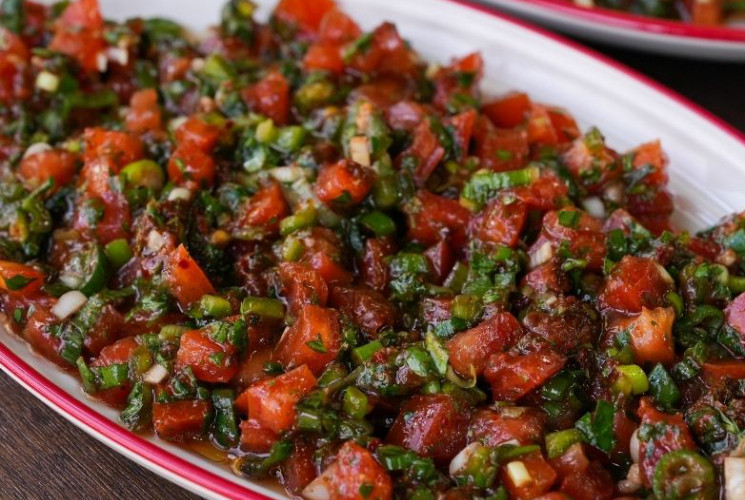 Malzemeler: 2 adet büyük boy domates Yarım demet taze soğan Yarım demet maydanoz Yarım yemek kaşığı biber salçası 2 diş sarımsak 2 adet sivri biber 1 tatlı kaşığı nane Yarım tatlı kaşığı tuz 1 tatlı kaşığı kırmızı biber Yarım limon suyu 1 yemek kaşığı nar ekşisi 3 yemek kaşığı zeytinyağı
