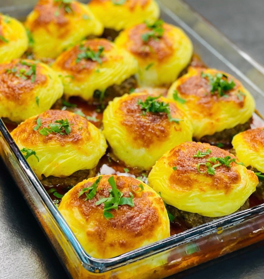 Yapılışı: Kıymayı uygun bir kaba alıyoruz. Soğan, sarımsak ve maydanozu robottan geçirip kıymaya ilave ediyoruz, diğer malzemeleri de ilave edip güzelce yoğuruyoruz. Üzerini kapatıp buzdolabında 1 saat dinlendiriyoruz. Daha sonra köfte harcımızdan parçalar alıp çanak şekli veriyoruz tepsimize yerleştiriyoruz. 200 derece fırında 20 dk pişiriyoruz. Patatesleri soyup dilimliyoruz ocakta yumuşayıncaya kadar haşlayıp suyunu süzüyoruz. Daha sonra güzelce ezip püre haline getiriyoruz. Tereyağı ,süt, tuz ve kaşar peyniri ilave edip tekrar karıştırıyoruz. Krema torbasına alıyoruz (kaşıkla da koyabilirsiniz). Fırından çıkardığımız köftelerin orta kısmına püremizi sıkıyoruz su ve salçayı karıştırıp köftemizin alt tabanına döküyoruz. Patates püresinin üzerine kaşar peyniri serpip tekrar fırına veriyoruz üzeri kızarana kadar pişiriyoruz.