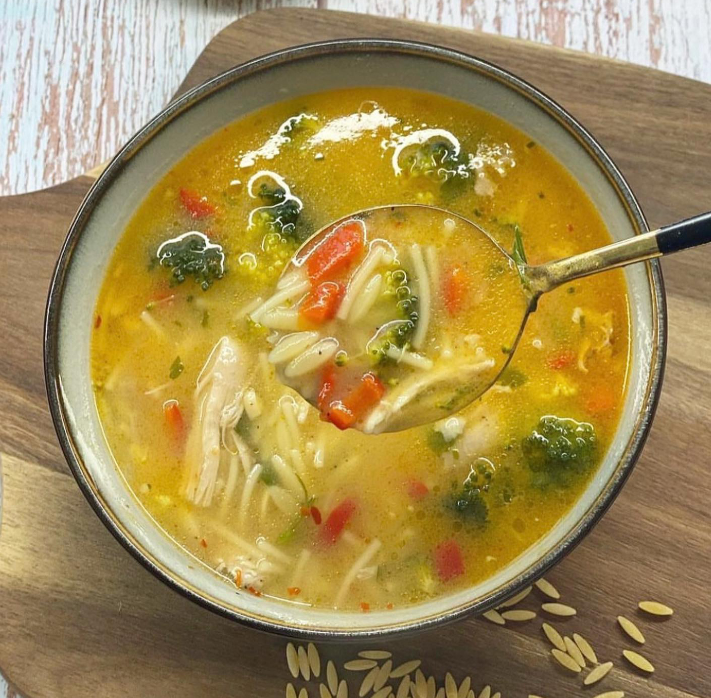 Hazırlanışı: Yapacağımız ilk şey tavuk suyumuzu hazırlamak olsun. Bunun için tavuk budunu bir tencereye alalım ve 7 su bardağı kadar su ekleyip haşlayalım. Düdüklü varsa daha kolay olacaktır. Haşlanınca soğumaya bırakalım.Etini ayırıp didikleyelim, tavuk suyunu bir tel süzgeçten geçirelim ki içinde parçalar olmasın. Geniş bir tencereyi ocağa alalım ve yağımızı ekleyip eritip küçük küçük doğranmış soğanı ve sarımsağı ekleyip güzelce kavuralım. Kavrulunca bir buçuk yemek kaşığı un ekleyip 1-2 dakika kavuralım. Küçük küçük doğranmış kapya biberini ekleyelim şöyle bir karıştırıp tavuk suyunu yavaşça ekleyip karıştırmayı ihmal etmeyelim.Tavuk suyunuz yeterli değilse ya da daya az kullanmak istiyorsanız suyla karıştırabilirsiniz. Taşmaya çok müsait o yüzden ocağın altını biraz kısın ve başında bekleyin. Çorbayı kaynamaya bırakıyoruz kaynadıktan 5-6 dakika sonra tel şehriyeleri ekliyoruz ve ara ara karıştırarak pişiriyoruz. Daha sonra brokolileri ekliyoruz baharatları ekliyoruz karıştırıyoruz ve birkaç dakika sonra tavukları da ilave edip 2-3 dakika kaynatıp yarım limonun suyunu ve ince doğranmış maydanozu ekliyoruz. Karıştırıp ocağın altını kapatıyoruz. Birkaç dakika dinlenen çorba hazır.