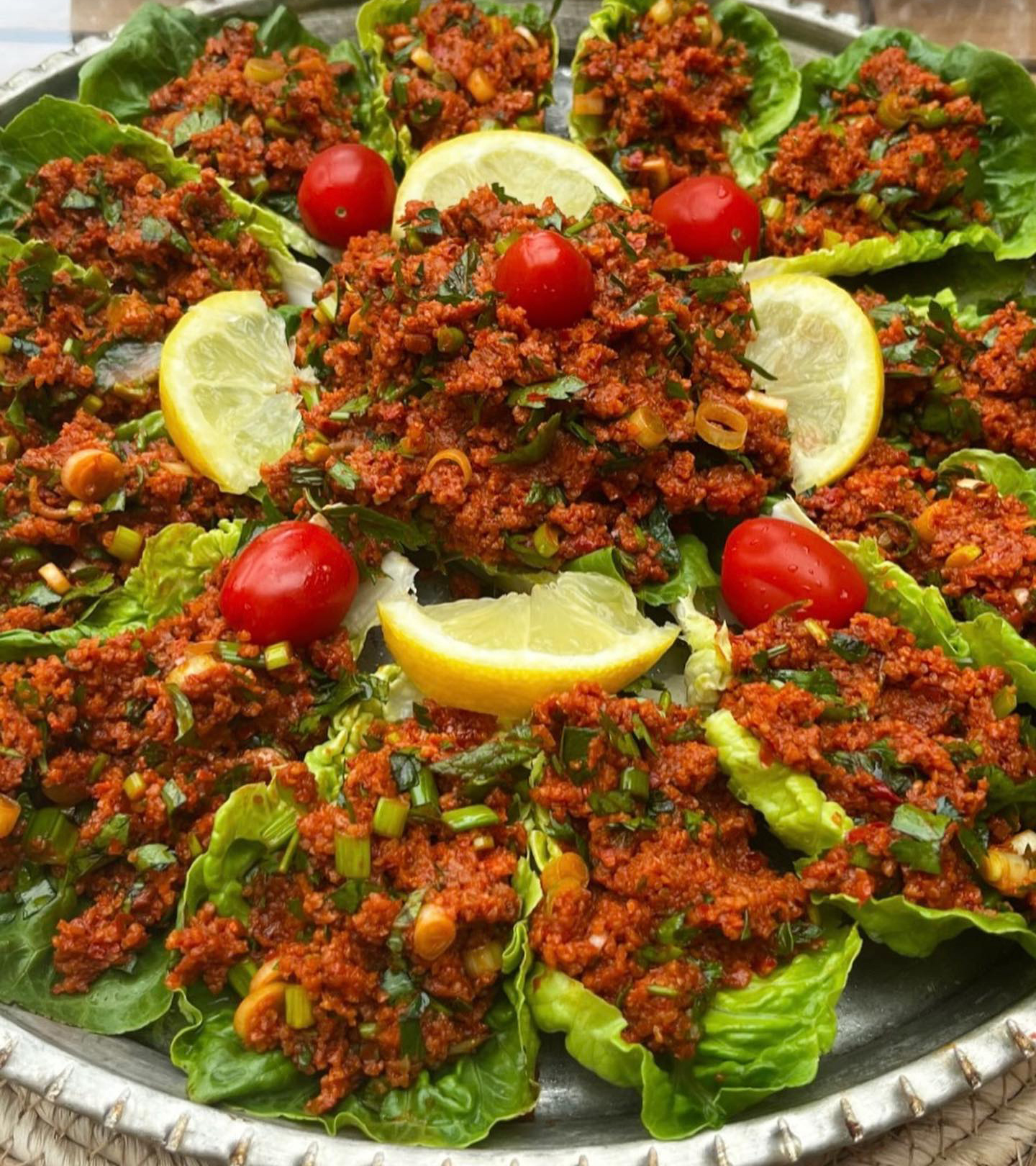 Malzemeler: 2 su bardağı ince bulgur 1 adet domates 1 adet küçük soğan 1 bağ taze soğan 1 demet maydanoz Biraz taze nane 3 yemek kaşığı biber salçası (Hatay biberi) 2 yemek kaşığı domates salçası Çay kaşığı ucuyla kimyon Çay kaşığı ucuyla karabiber Tuz 1 çay bardağı zeytinyağ Yarım çay bardağı sıvı yağ Limon 2 yemek kaşığı nar ekşisi Marul