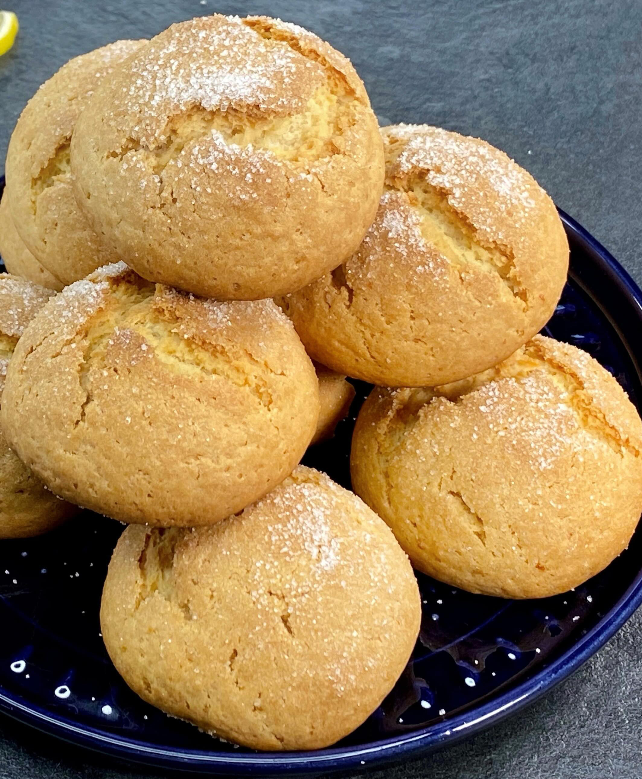 Hazırlanışı: Öncelikle karıştırma kabına yumurta, yoğurt ve sıvı yağı alarak tel çırpıcı yardımıyla güzelce çırpalım. Malzemeler iyice karıştığında toz şeker, vanilya, limon kabuğu rendesi, kabartma tozu, unun bir kısmını karıştırma kabına ilave edelim ve bir spatula yardımıyla güzelce karıştıralım. Kalan unu da ilave edip hamurumuzu hazırlayalım. Bu kurabiyenin hamuru hafif ele yapışan bir hamur olmalı ekstra un ilavesi yapmamalısınız. Daha fazla un eklerseniz kurabiyeleriniz sertleşebilir. Hamurdan yumurta büyüklüğünde parçalar kopararak şekil verelim ve fırın tepsisine yerleştirelim. Tüm hamur bitinceye kadar bu şekilde devam edelim. Ben bu ölçülerle hazırladığımda tam 13 adet kurabiye elde ettim, kurabiyelerinizin büyüklüğüne göre bu sayıyı değiştirebilirsiniz. Hazırladığımız kurabiye hamurlarını fırına vermeden önce üzerlerine toz şeker serpelim. Önceden 175 derece ısıtılmış fırında alt üst fansız ayarda 25 dakika pişirelim.