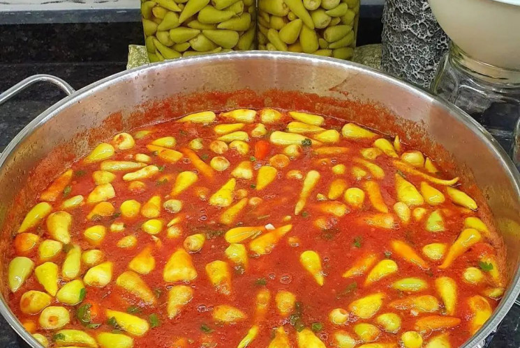 Malzemeler: 3 kg domates 750 gr küçük acı biber (kıl biber de olur) 1 baş sarımsak Yarım demet maydanoz 1,5 su bardağı sirke 1 su bardağı zeytinyağı 2, 5 yemek kaşığı kaya tuzu 1 yemek kaşığı şeker 1 çay kaşığı limon tuzu