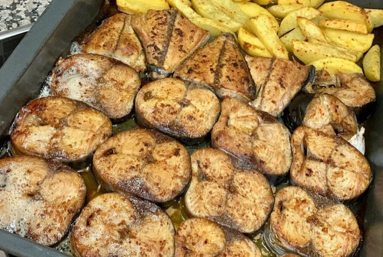 2 büyük balık için sos miktarı azaltıp çoğaltabirsiniz Malzemeler; 2 adet büyük palamut ( yuvarlak olarak kesilmiş) 4-5 yk sıvıyağ 1 yk tereyağ 3 diş sarımsak Yarım limon suyu Pul biber, karabiber, pul biber, tuz baharatları istediğiniz miktarda kullanabilirsiniz (1 çay kaşığı veya az fazla kullandık)