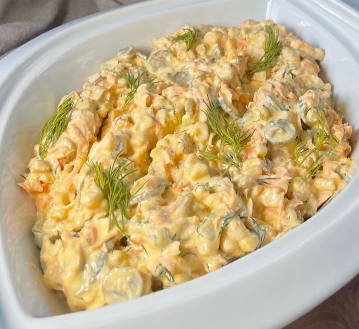 Malzemeler: 4 adet orta boy havuç 10 adet kornişon turşu 1 küçük kutu konserve mısır (150 g) 1 küçük su bardağı iri dövülmüş ceviz 5 dolu yemek kaşığı süzme yoğurt 2 dolu yemek kaşığı mayonez 1-2 diş sarımsak 3-4 yemek kaşığı zeytinyağ 1 tatlı kaşığı tuz Yarım demet taze dereotu