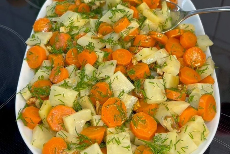 apılışı kereviz ve havuçlar video daki gibi doğranır sarımsak rendelenir 2.3 yemek kaşığı sıvı yağ ile 1 dakika kadar çok az kavrulur ve havuç kereviz eklenir 2.3 dakika sotelenir su ve portakal suyu eklenir üzeri kapatılır orta ateşte 15.20 dakika pişirilir test edin yumuşamış olsun soğuduktan sonra sos ve diğer malzemeleri eklenir servis yapılır