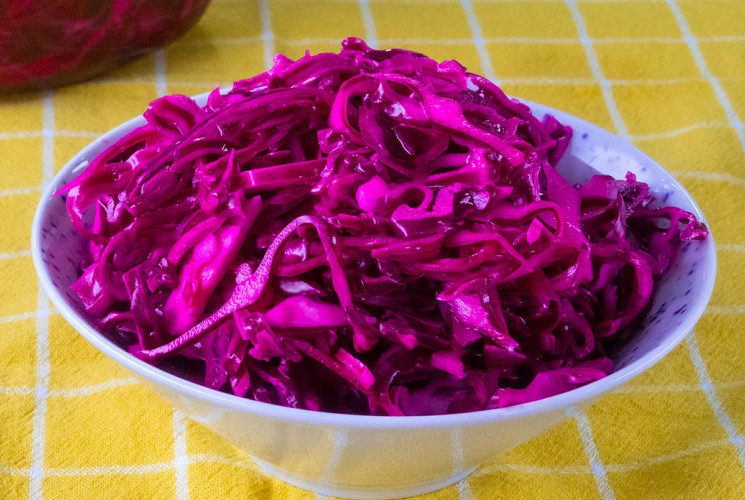 Malzemeler: 1 adet orta boy kırmızı lahana 1 adet limon 1,5 çay bardağı sirke 1 tatlı kaşığı tuz 1 su bardağı su 1 çay kaşığı toz şeker