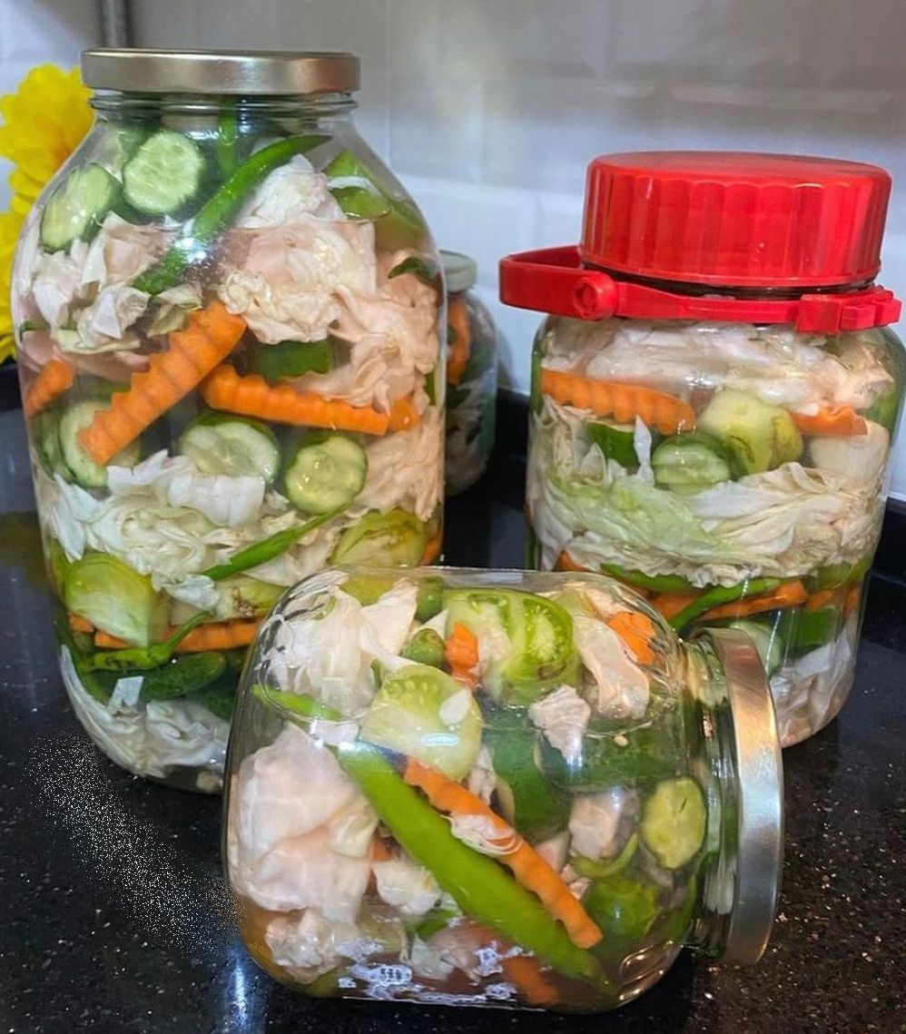 Malzemeler 1 orta boy lahananın orta kısmı (Kenarlarını sarma için kullandım) 1 kilo kadar kornişon salatalık 5-6 adet havuç 1 buçuk bas sarımsak 1 litrelik kavanoz için 1 yemek kaşığı iri tuz 1 litrelik kavanoz için 1 çay bardağı üzüm sirkesi (Elma sirkesi de olur) Sıcak su Hiç kullanılmamış kapak Dilerseniz bir çay kaşığı limon tuzu da ekleyebilirsiniz İçine biberde ekleyebilirsiniz