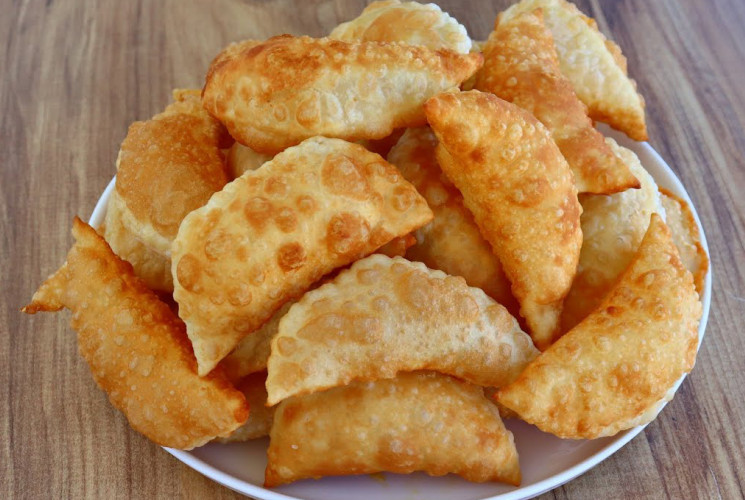 Yapılışı: Yoğurma kabına un, tuz ve tereyağı ekleyip karıştıralım. Üzerine kontrollü bir şekilde su ekleyip yumuşacık ele yapışmayan bir hamur yoğuralım.Hamuru 2 eşit bezeye bölelim ve üzerini kapatıp 20 dakika bekletelim.Bezelerden ilkini tezgaha alalım ve ince olacak şekilde merdane ile açalım. Çorba kasesinin ağız kısmı ile hamuru keselim.İç harcını ekleyelim ve ay şeklinde katlayıp kenarlarına parmak uçlarımızla bastıralım. Ruletle kenar kısımlarını kesip düzeltelim.Bol ve kızgın yağda her iki tarafını çevirerek kızartalım.Sıcak servis edelim.